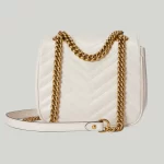 The GG Marmont has become synonymous with the House, thanks to its recognizable matelassé fabric and Double G hardware. Continuously reinvented through the seasons, new shapes are introduced within this signature line, matching Gucci’s contemporary vision. Here, it’s presented in white leather and further enriched with antique gold-toned details.